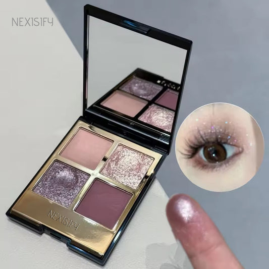 Four-color eyeshadow palette featuring low saturation, pearl, matte, shimmer, and glitter finishes